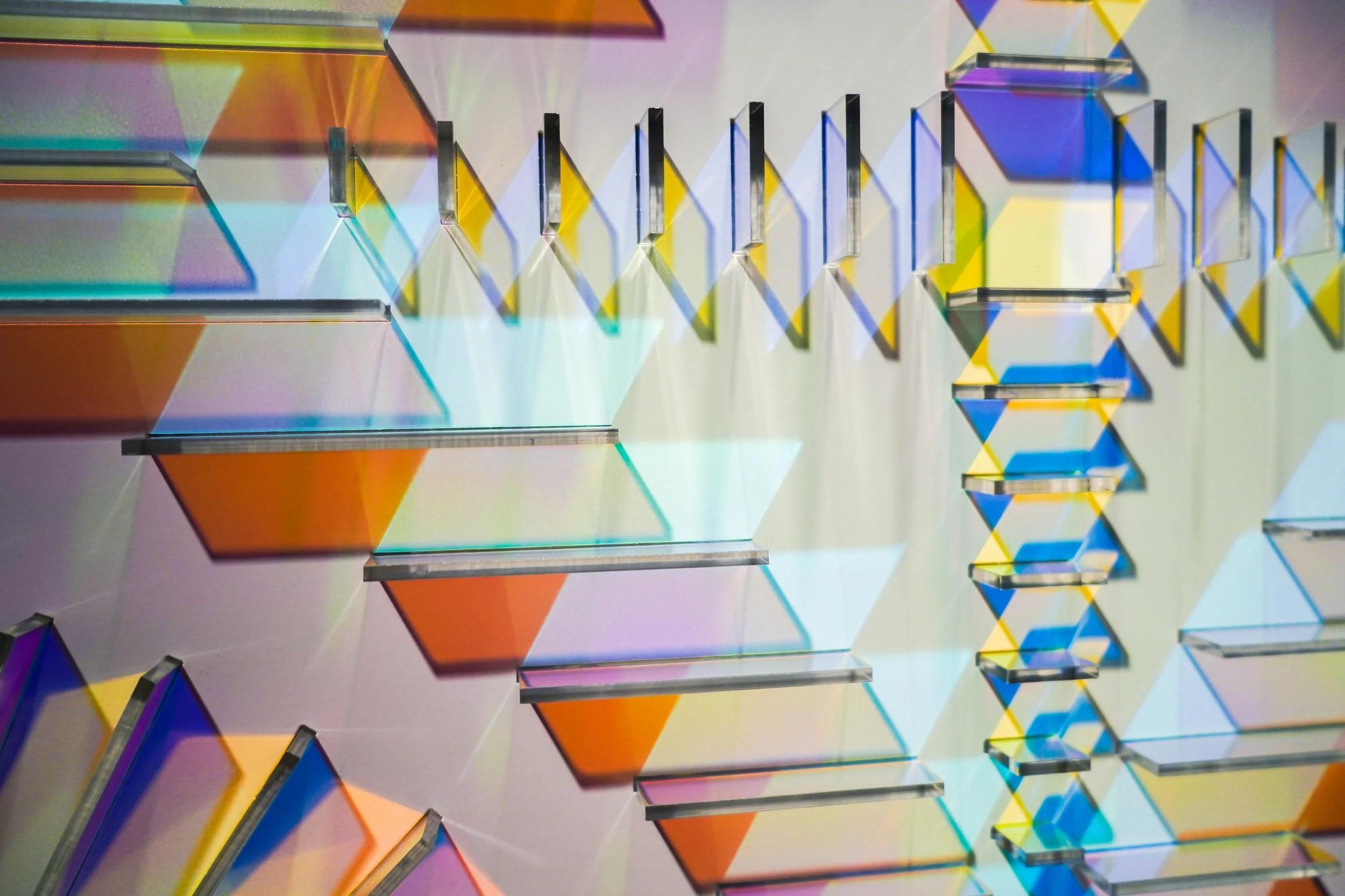 The varying sizes of dichroic elements take the flowing curves of the identity into a new dimension, creating patterns and movement for light to interact with.